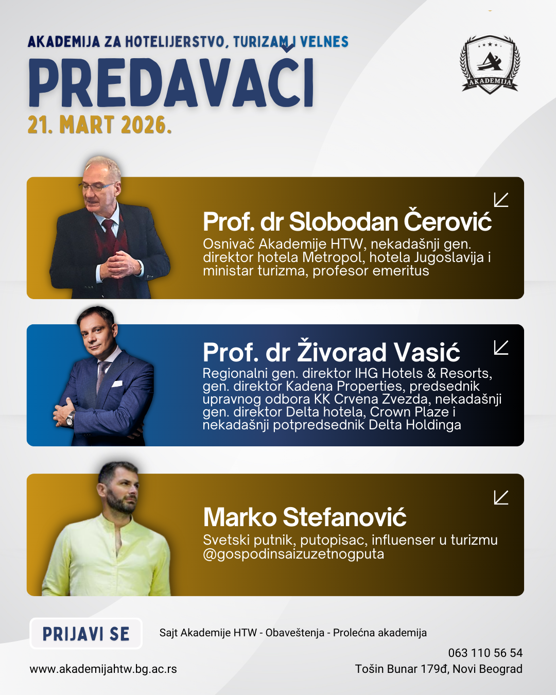 Prolećna akademija je namenjena srednjoškolcima, studentima i svima koji rade ili žele da rade u turizmu i hotelijerstvu, a žele da iz prve ruke čuju iskustva i priče istaknutih stručnjaka iz sektora.